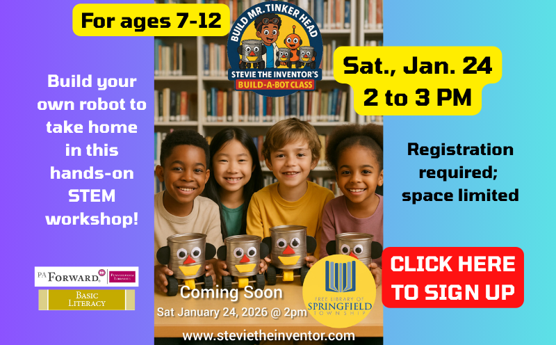 Stevie The Inventor is bringing his hands-on Build-A-Bot STEM experience to our library for an hour of creativity, engineering, and fun. Kids will learn how to build their very own motorized mini-robot using everyday materials—guided by Stevie The Inventor and Spark The Bot!