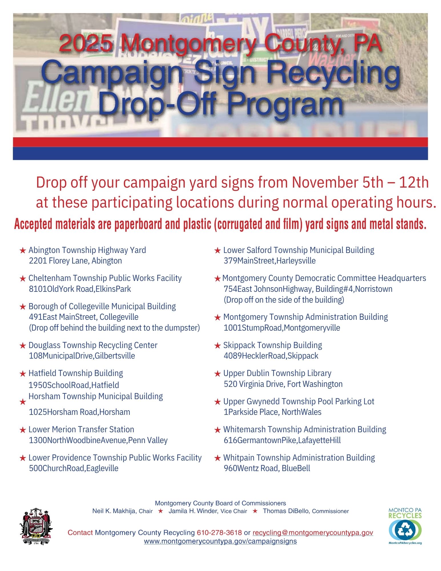 With election season wrapping up, Montgomery County is offering residents a convenient way to recycle their campaign yard signs following Election Day. From November 5th through November 12th, yard signs can be dropped off at participating locations during normal operating hours to be recycled. This initiative helps keep plastic and metal out of landfills by ensuring that signs and stakes are properly recycled.
