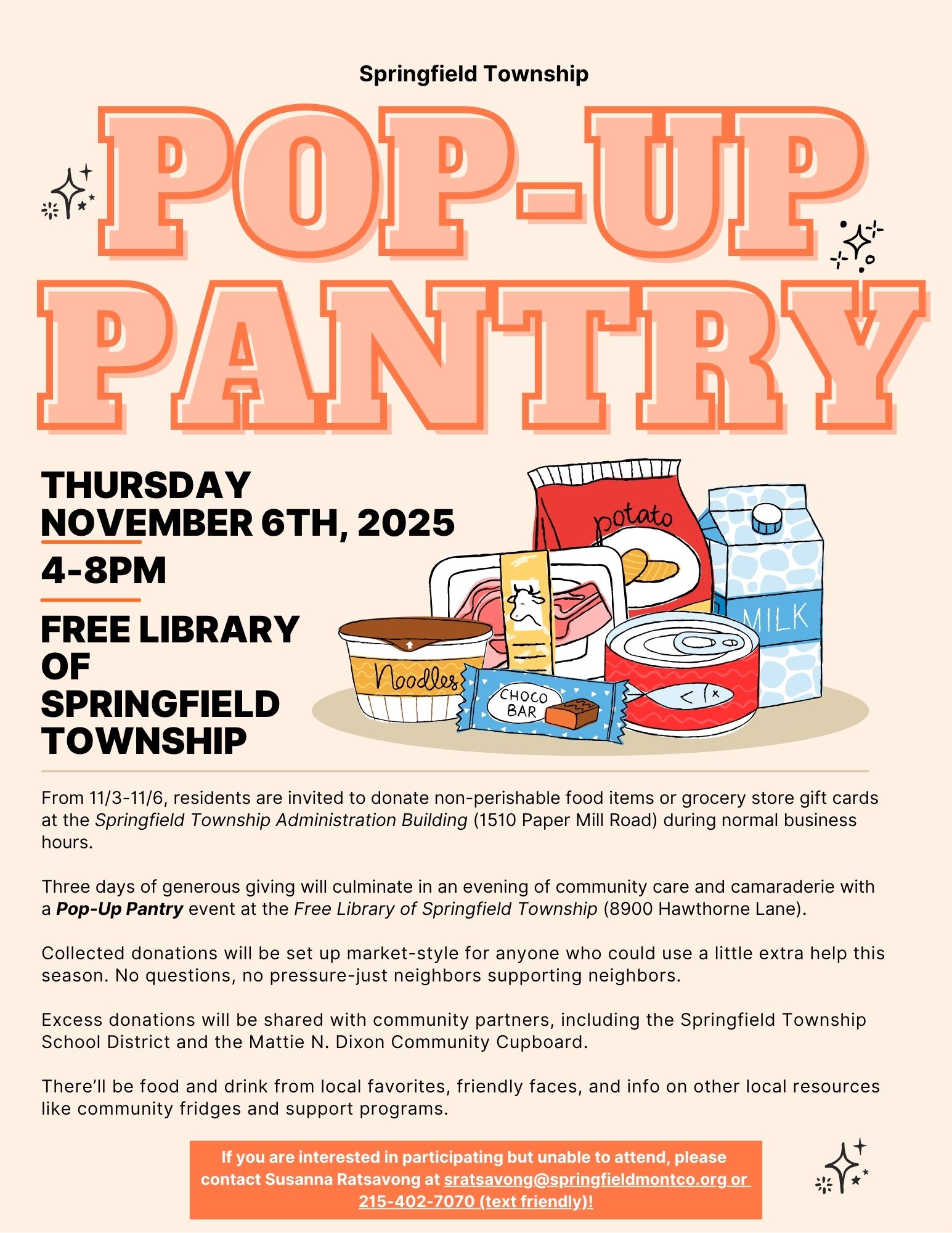 From November 3rd until November 6th, residents are encouraged to donate non-perishable food items or grocery store gift cards at the Springfield Township Administration Building (1510 Paper Mill Road) during normal business hours. Three days of generous giving will culminate in an evening of community care and camaraderie with a Pop-Up Pantry. Donations will be set up market-style for anyone who could use a little extra help this season. No questions, no pressure- just neighbors helping neighbors.