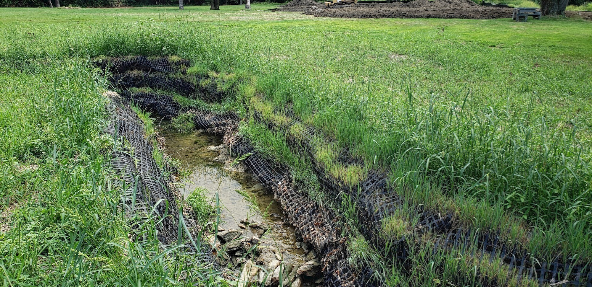 As opposed to traditional armored or concrete streambank stabilization techniques, the Township utilized a more green/sustainable approach to this portion of the project. Instead, the Township opted to use a vegetative or living wall product where the plant material contained in affixed mesh socks will grow into the streambank. The roots of the vegetation then locks soil in place and stabilizes the streambank using the natural rootsystem. The addition of vegetation growing through the facing with healthy roots penetrating the entire structure adds environmental service, natural aesthetics and structure.